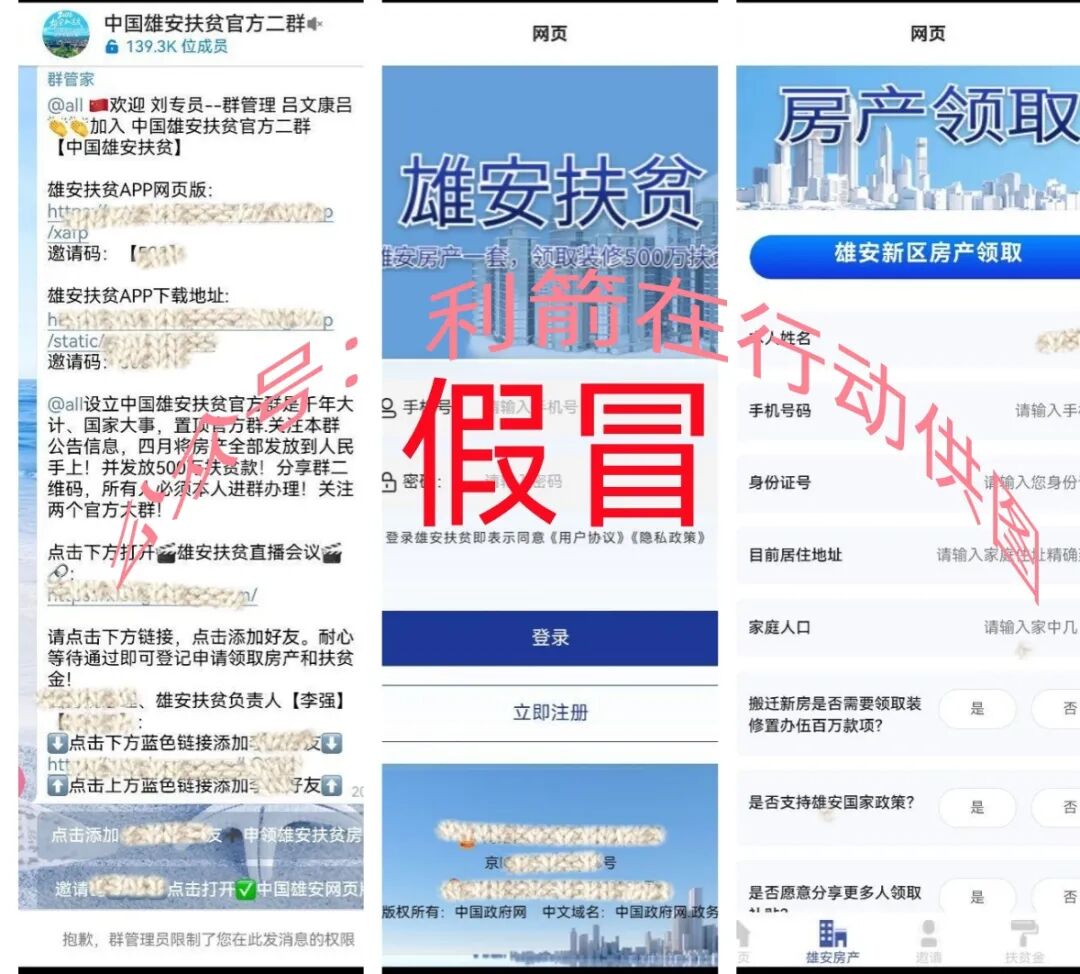近期网络中出现了打着“国家项目”旗号的雄安扶贫APP,该项目宣传“实名认证注册就能获得雄安新区房产+500万元扶贫款+邀请奖励.........”?这是假冒官方的民族资产解冻类诈骗项目,前期骗取参与者身份信息,后期兑现的时候,就会让参与者交各种费用进行诈骗,请大家提高警惕,别中了骗子精心设计好的圈套。