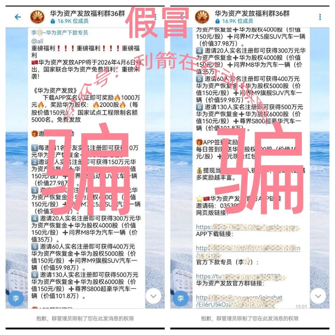 提醒:假冒的“华为资产发放”APP是前期骗取参与者身份信息,后期参与者想提现,就会被要求交各种费用进行诈骗,而平台永远不会兑现。