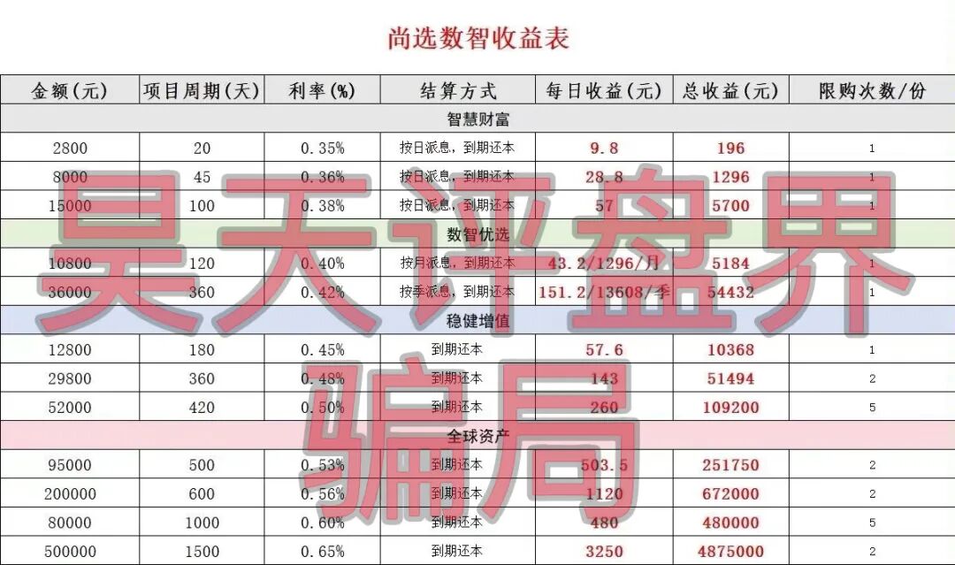 昊天评盘界友情提醒:尚选数智商城分红类资金盘骗局,日收益高达0.65%,投资50万1500天收益高达487万,高度预警,即将崩盘跑路!近期昊天评盘界发现知乎,小红书,微博,抖音等app都有冒充昊天的诈骗团伙,希望大家记住了昊天评盘界是反诈自媒体账号并不做任何项目,更不会去推广任何项目,除公众号外其他一律不是本人,切勿上当受骗!