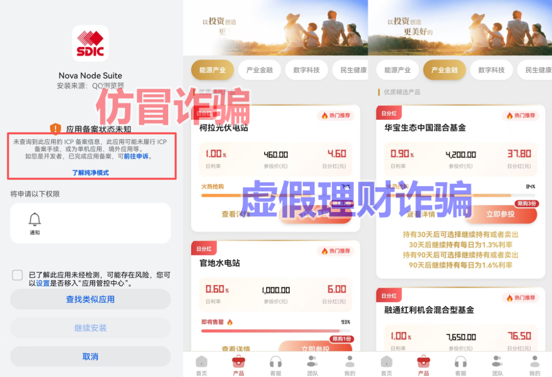 经网友反馈的资料,该项目冒充央企“国家开发投资集团”公司的名义,该软件只能通过未知链接下载,下载提示该软件未经过ICP备案,最重要的疑点,该项目收款账户不是该项目宣称的央企官方收款账户,而是一些个人、第三方公司,该项目是典型的套牌诈骗。