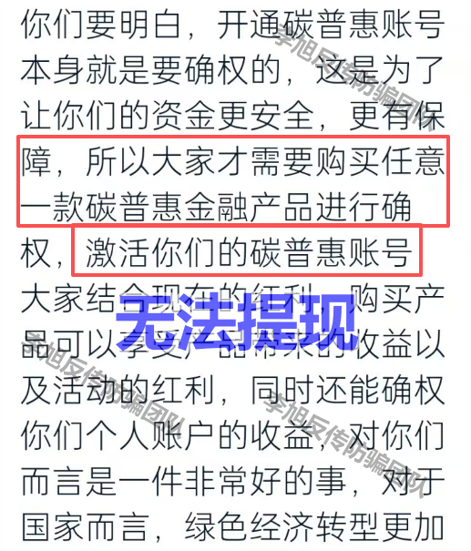 近日,多位参与者向李旭反传防骗团队反馈,该项目已经无法提现,而参与者想要提现,必须开通碳普惠账户进行确权,而且还需要购买产品才可以。